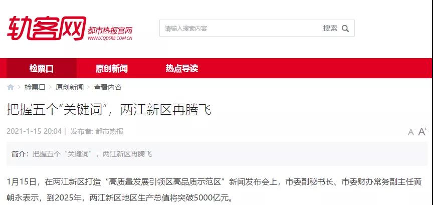 重慶之聲1月15日19點(diǎn)《968晚新聞》播出頭條消息:兩江新區(qū)打造高質(zhì)量發(fā)展區(qū)高品質(zhì)生活區(qū),2025年GDP將達(dá)5000億元。